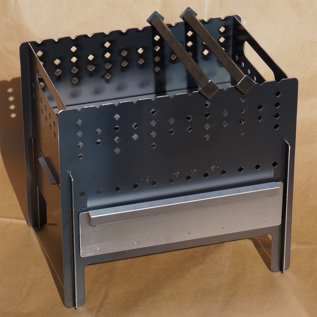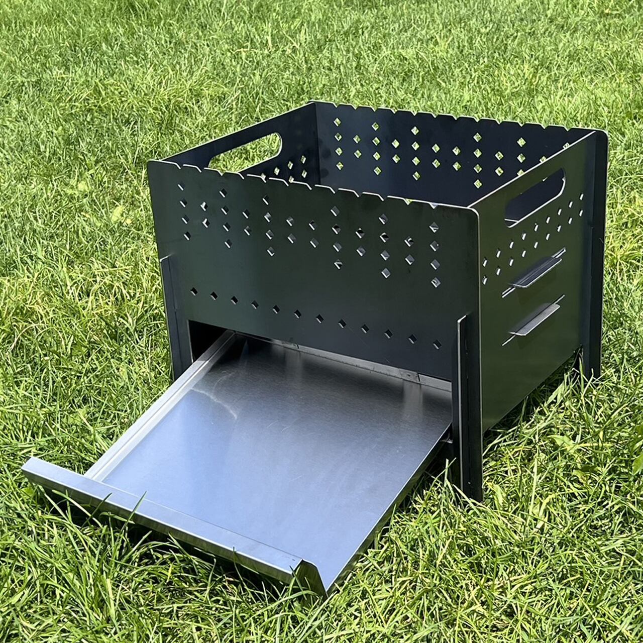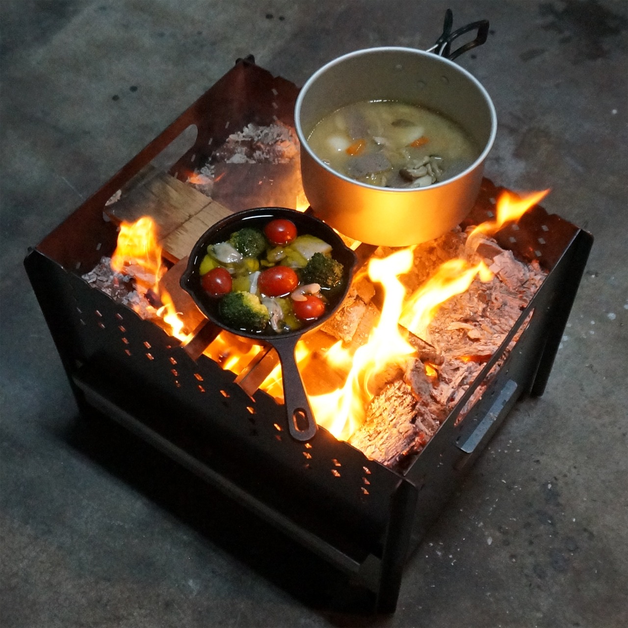 焚き火をしながら上部で調理、下部に付いている引き出し式の