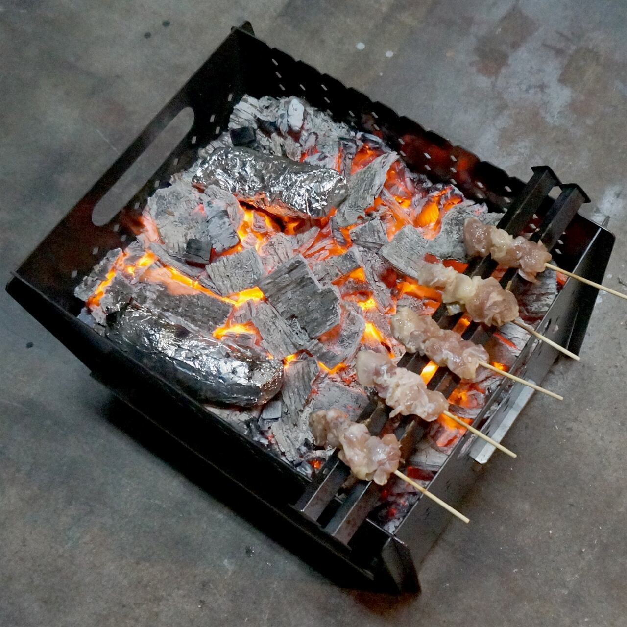 焚き火台の上に市販の網を乗せてBBQも楽しめます。