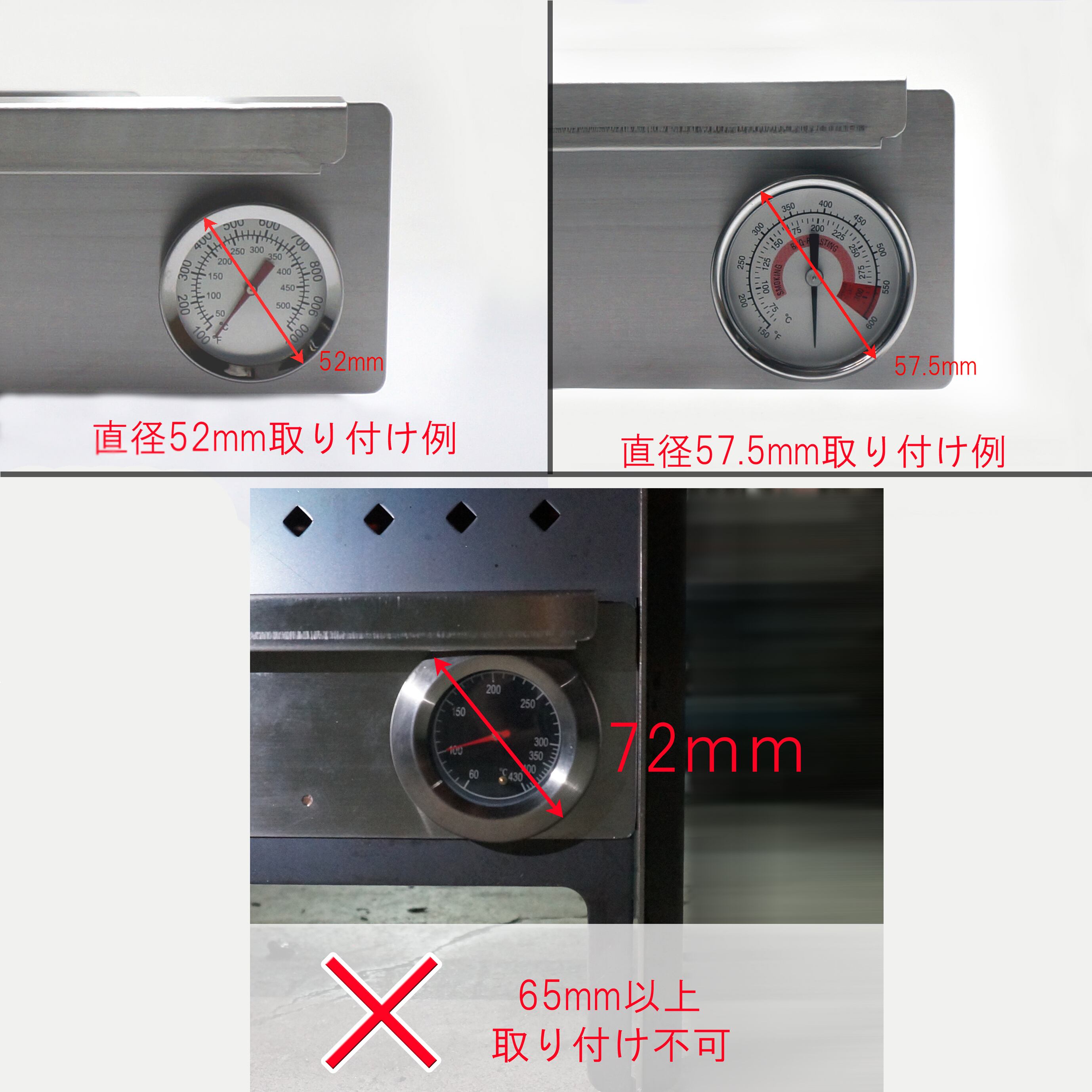 温度計取付穴は標準で画像の寸法で空いていますが、穴の大きさ・位置の変更は可能ですのでご購入前にお問い合わせください。